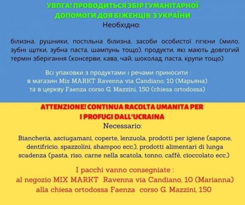 Inoltre è possibile consegnare i pacchi viveri alla chiesa ortodossa di Faenza (corso Mazzini, 150). Le consegne si possono effettuare: mercoledì e giovedì ore 17-19; sabato ore 17-18:30.